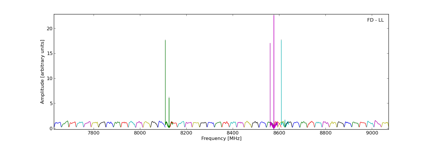Total power spectrum in arbitrary units. The solid lines indicate the mean value and the shaded area the peaks.