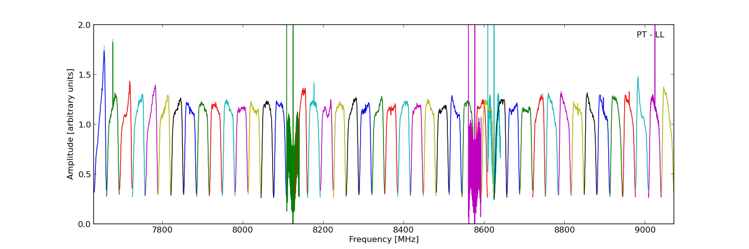 Total power spectrum in arbitrary units. The solid lines indicate the mean value and the shaded area the peaks.